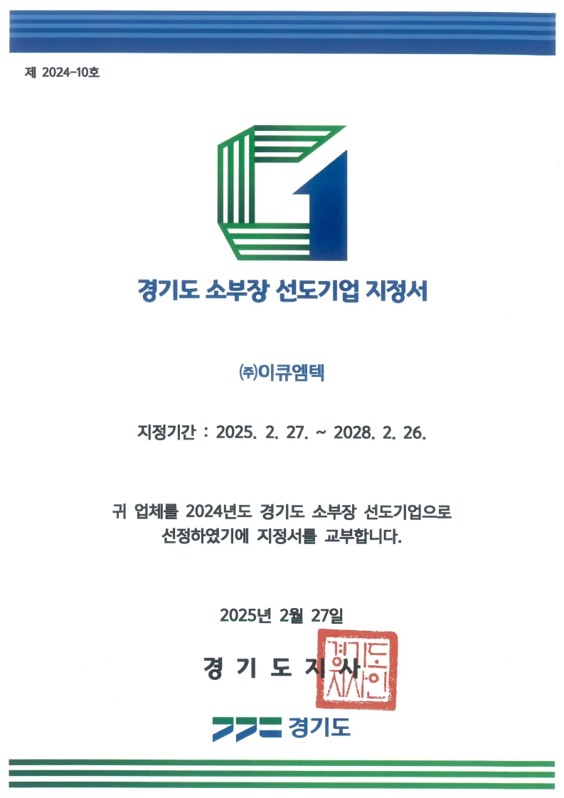 이큐엠텍(주), 경기도 소부장 선도기업 선정